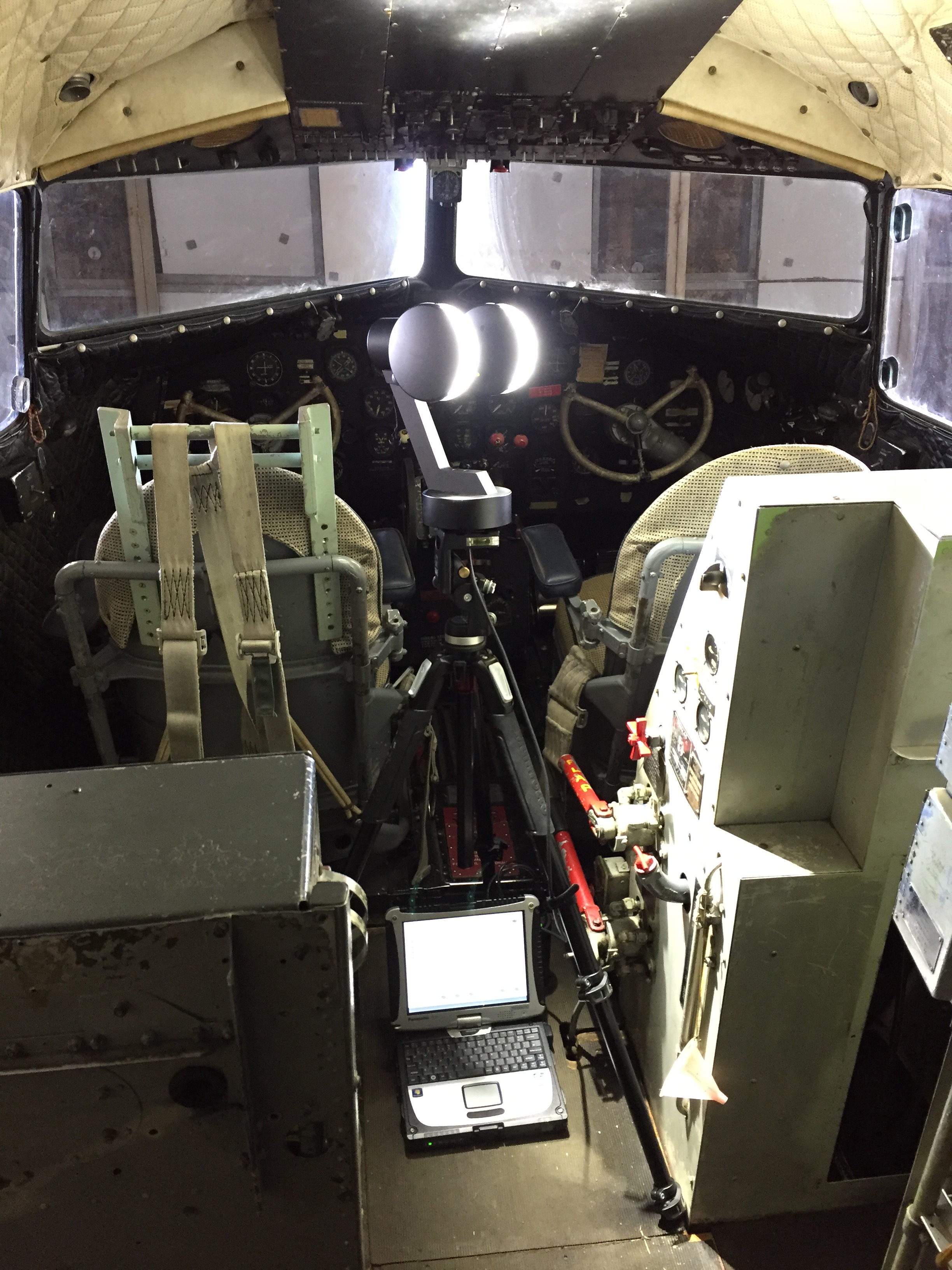 I used the SpheronVR SceneCam plus ScanLight attachment for all the scans, the ScanLight ensuring a consistency of illumination for all the scans. This was useful, as the 604 hangar has inconsistent lighting coverage, plus the interior would be dark (as there is no lighting inside the C47).