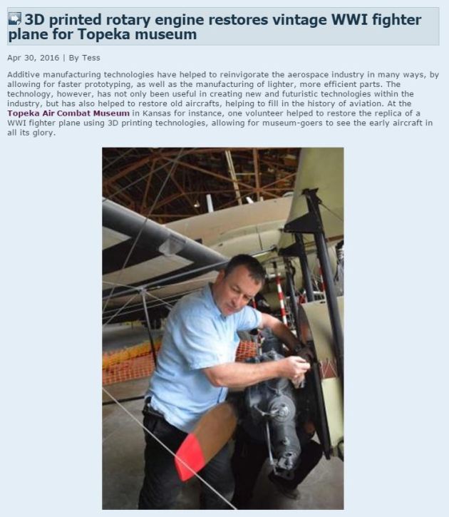 04 / 2016 3DERS article on Gnome engine Read the full article here http://www.3ders.org/articles/20160430-3d-printed-rotary-engine-restores-vintage-wwi-fighter-plane-for-topeka-museum.html Share this: Click to share on X (Opens in new window) X Click to share on Facebook (Opens in new window) Facebook Like Loading...